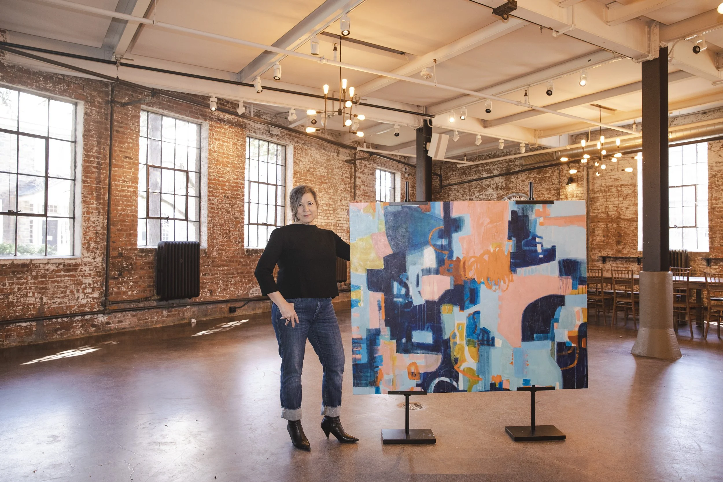 Devoted to the idea of creating works of distinctive beauty, using striking color combinations and strong line, she is influenced by her background in fashion as a designer and illustrator. There is an underpinning of gesture and exuberant color that forms the foundation of each work.
